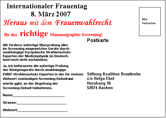 Hier können sie unsere Forderung unterstützen und eine PDF-Version zum Ausdrucken herunterladen. Download PDF-Version: Internationaler Frauentag 2007.pdf